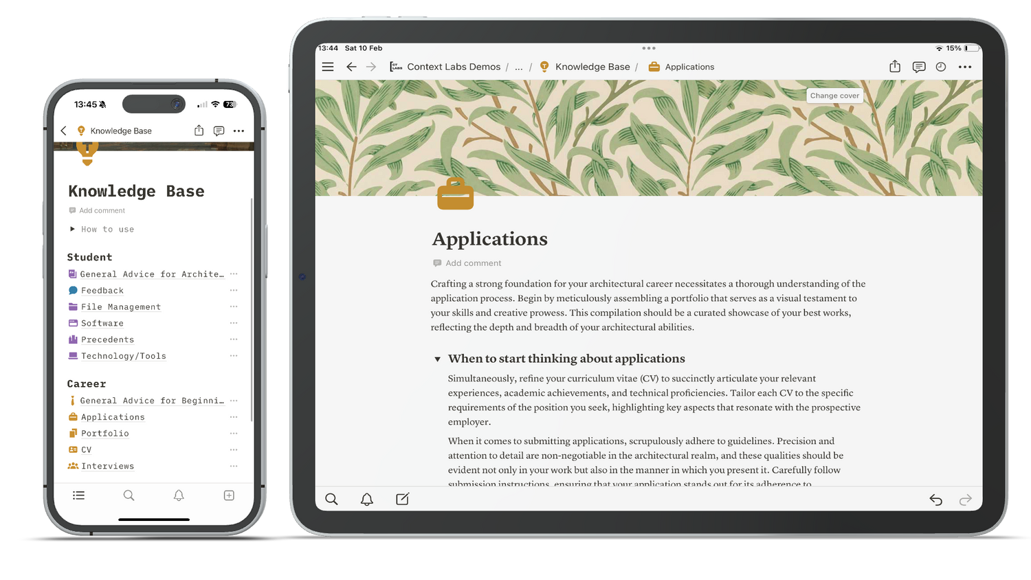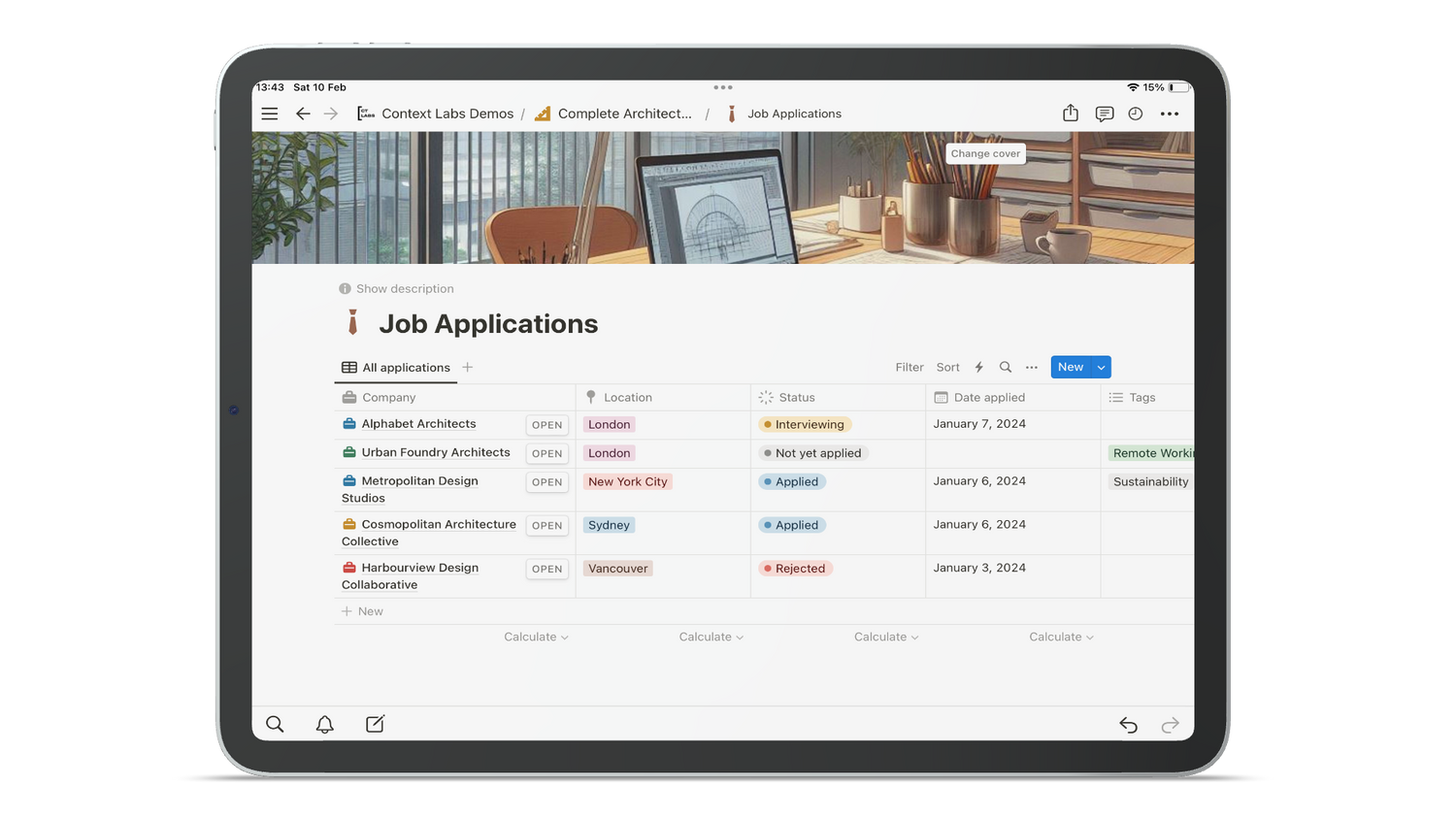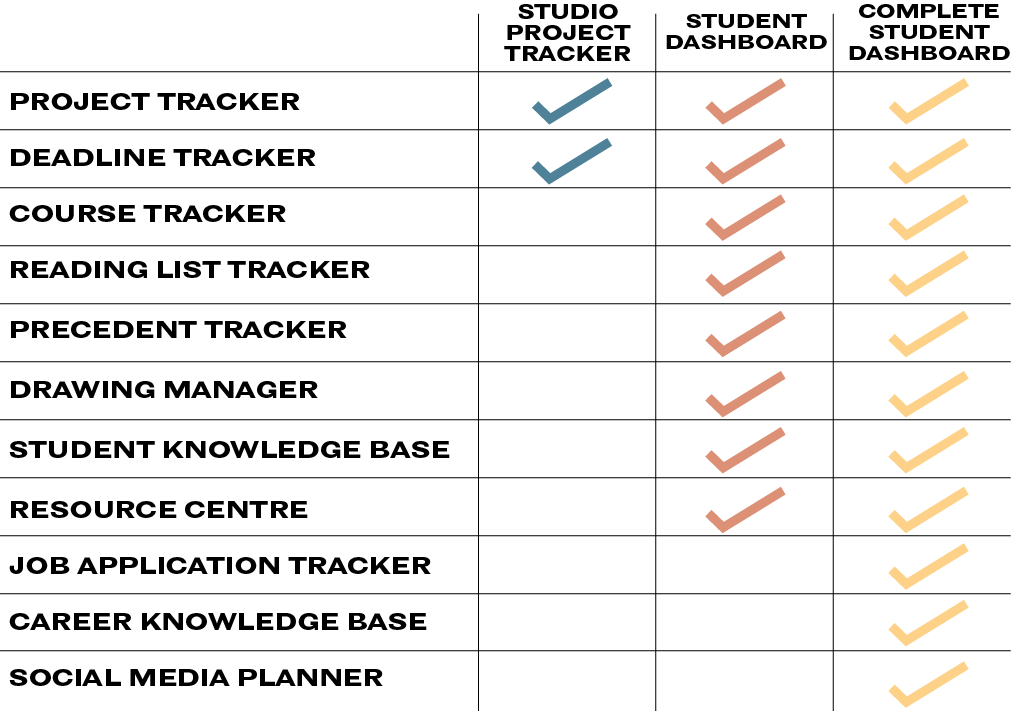 If you are going to be finishing your studies soon, or you already know you definitely want to become an architect, we recommend the Complete Student Dashboard, which includes a Job Application Tracker, a Social Media Planner and an additional section in the Knowledge Base with information on preparing a CV and portfolio, applying for jobs and preparing for interviews.