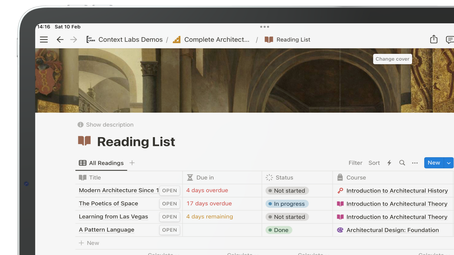 The reading list draws together all your required readings from your different courses so you can easily stay on top of what's due with tools to to see how many days are remaining on each, sort by status or course, and easily switch between list and calendar views.